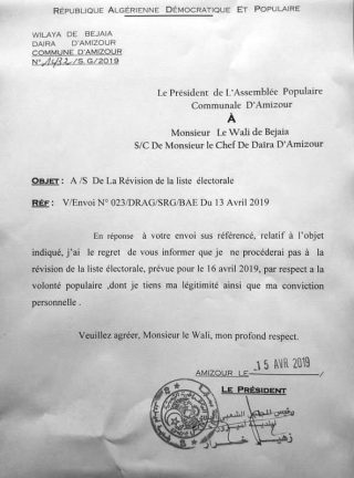 Le maire de la commune d’Amizour annonce dans un courrier communiqué au Wali de Béjaia « J’ai le regret de vous informer que je ne procéderai pas à la révision de la liste électorale prévue pour le 16 avril 2019. »