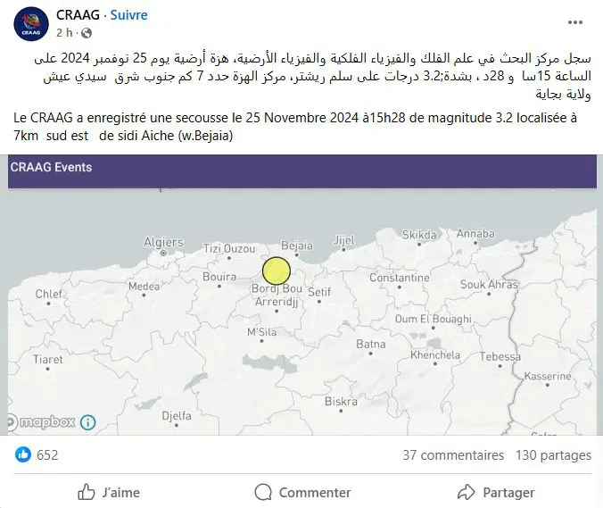 Selon le communiqué du CRAAG, le tremblement de terre, d’une magnitude de 3,2 sur l’échelle de Richter, s’est produit à 15h28. L’épicentre a été localisé à 7 km au sud-est de la commune de Sidi Aïch, dans la wilaya de Béjaïa.
