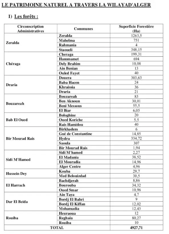 Comme le montre le tableau ci-dessous, ces 5 000 hectares de forêt se répartissent sur tout le long de la côte algéroise. Ainsi, nous retrouvons des espaces boisés naturel à Zeralda, Chérage, Draria, Bouzareah, Bab El Oued, Bir Mourad Raïs, Sidi M’hamed, Hussein Dey, El Harrach, Dar El-Beida et Rouiba.