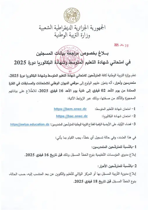 Le ministère de l’Éducation nationale vient de lancer un appel à tous les candidats aux examens du Brevet de l’Enseignement Moyen (BEM) et du Baccalauréat (BAC), session 2025.