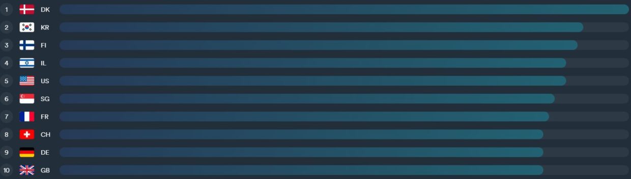 Les pays qui constituent le top 10 mondial sont les suivants : Le Danemark, la Corée du Sud, la Finlande, Israël, les États-Unis, Singapour, la France, le Suisse, l’Allemagne et le Royaume-Uni. Le premier pays arabe au classement est le Qatar qui figure au 33e rang mondial (consulter le classement intégral ICI).