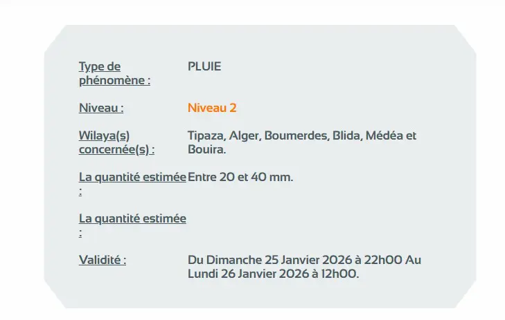 🟢 A LIRE AUSSI : Pluies, neige et mer dangereuse : quelles wilayas sont concernées par la vigilance météo ce 25 janvier ?