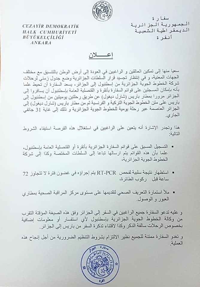 L’ambassade d’Algérie à Ankara a annoncé hier, vendredi, 22 janvier, que les ressortissants Algériens bloqués en Turquie, à cause de la pandémie du Coronavirus (Covid-19), peuvent regagner le pays en effectuant une escale à Paris en France.