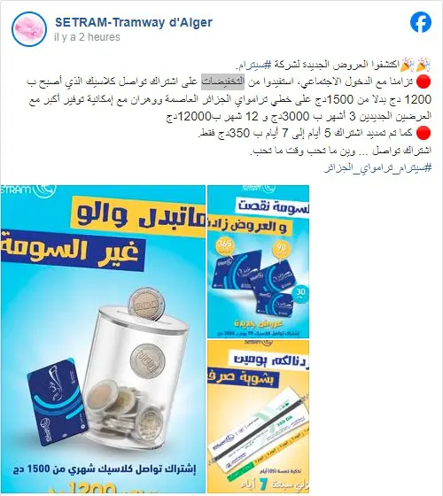 ALGER, le 01 octobre 2024 – SETRAM, la société d’exploitation des tramways d’Alger, invite les usagers à profiter pleinement de la rentrée sociale en leur offrant de nouvelles réductions sur les abonnements. Comme l’indique leur communiqué : « À l’occasion de la rentrée sociale, profitez de réductions sur l’abonnement ».