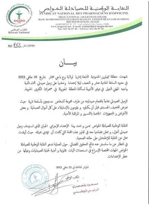 Suite à ce terrible incident, le Syndicat National Des Pharmaciens d’Officine a dénoncé cette « attaque criminelle et lâche qui a visé un confrère pharmacien non armé, et lui a déclaré sa solidarité pour surmonter cette épreuve qui a failli lui coûter la vie, en envoyant un représentant du syndicat pour vérifier son état de santé. »