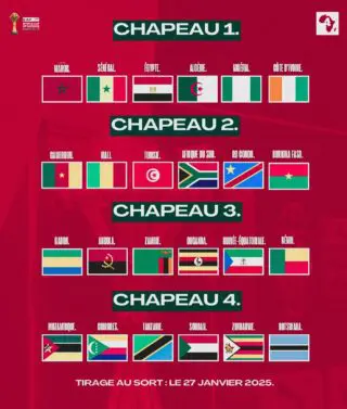 Au Pot 2, on trouve des sélections redoutables, à savoir la Tunisie, le Cameroun, le Burkina Faso, la RD Congo, le Mali et l’Afrique du Sud. Le Gabon, l’Angola, la Zambie, l’Ouganda, la Guinée-Équatoriale et le Bénin figurent dans le pot 3. Enfin, le Botswana, le Mozambique, le Soudan, le Zimbabwe, Comores et la Tanzanie complètent le pot 4.