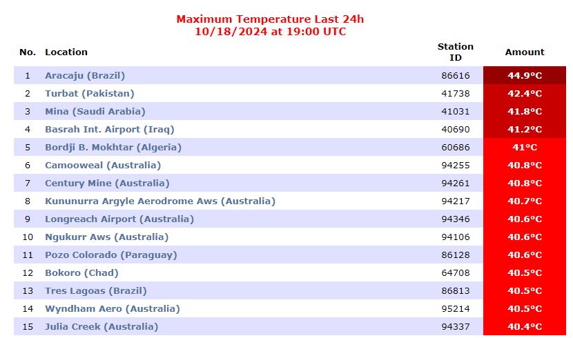 Le classement des villes les plus chaudes est dominé par Arecibo, au Brésil, qui a enregistré une température record de 44,9°C. En deuxième position, Turbat, au Pakistan, a enregistré 42,4°C.