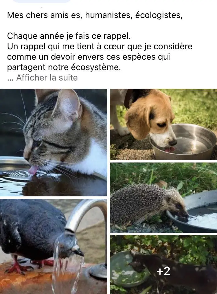 Le message ajoute, « Il y a des créatures qui meurent chaque jour de soif faute de notre égoïsme urbain. C’est un devoir envers ces espèces qui partagent notre écosystème. N’hésitez pas à laisser un peu d’eau dans/sur vos jardins, terrasses, balcons, fenêtres ».