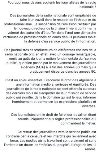 « C’est un enjeu essentiel. Il recouvre le droit des Algériens à une information crédible, sérieuse et équilibrée. Des journalistes de la radio nationale se sont efforcés au cours des derniers mois de s’acquitter de leur mission de service public qui signifie, dans le domaine qui est le leur, informer honnêtement et permettre les expressions plurielles et diverses », lit-on dans le document.