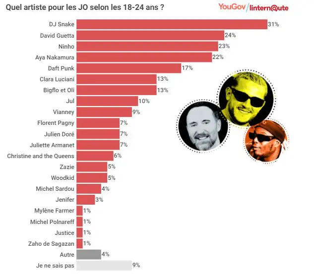 Parmi les surprises de ce sondage, DJ Snake se distingue particulièrement. Classé en sixième position avec 9% des suffrages globaux, il s’érige en véritable favori auprès des jeunes adultes (18-24 ans), recueillant 31% de leurs voix. Cette préférence marque la reconnaissance de son talent à l’international. En effet, le DJ d’origine algérienne connaît déjà un franc succès mondial, collaborant avec les plus grandes célébrités.