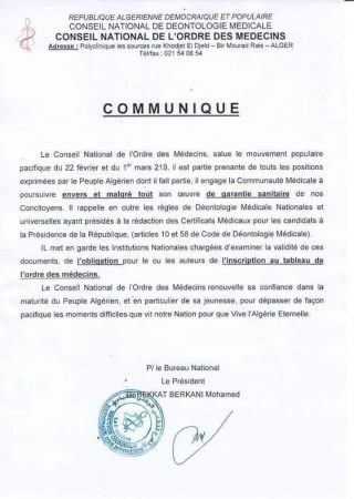 D’autre part, l’ordre des médecins salue le mouvement populaire contre le 5e mandat du candidat Bouteflika, et adopte « toutes les positions exprimées par le peuple ».