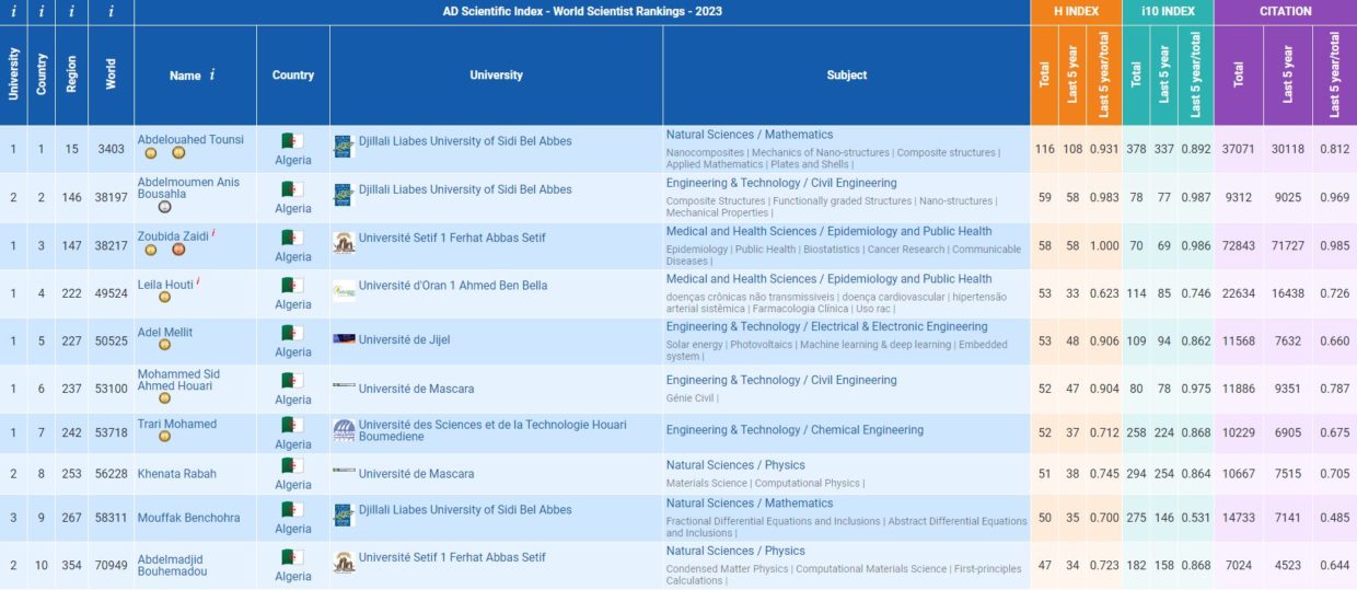 - Mohammed Sid Ahmed Houari de l’université Mustapha Stambouli de Mascara [indice h : 52] — Classement mondial [en Afrique] : 52,873 [237] — Catégorie : Génie civil