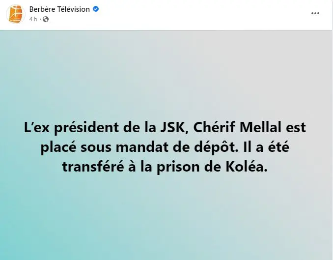L’ancien président de la JS Kabylie, Cherif Mellal, est au cœur d’une affaire de corruption. Présenté aujourd’hui (jeudi 19 janvier 2023) devant le juge d’instruction près le tribunal de Sid M’hamed (Alger), ce dernier a décidé, après l’avoir entendu, de le mettre sous mandat de dépôt, a-t-on appris de nos confrères d’El Khabar.