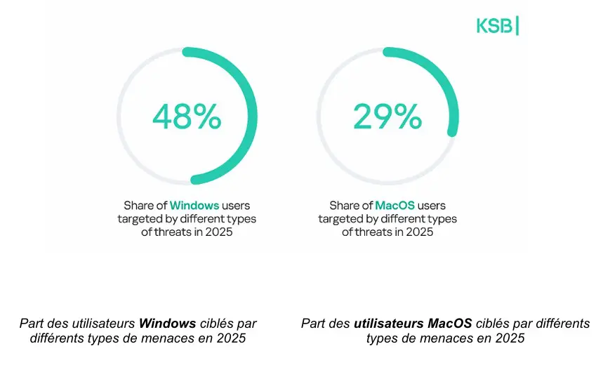 Sans surprise, Windows reste la plateforme la plus ciblée. En 2025, 48 % des utilisateurs Windows ont été exposés à différents types de menaces. Du côté de MacOS, souvent perçu comme plus sûr, la réalité est plus nuancée, car 29 % des utilisateurs ont également été touchés.