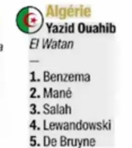 Dans ce sens, on peut lire dans les pages intérieures de France Football que, « le vote du représentant de la presse algérienne est le suivant : la première place revient à Karim Benzema. Sadio Mané et Mohamed Salah complètent le podium du vote de l’Algérie pour la 66e édition du Ballon d’Or. » indique le bulletin de vote de l’Algérie publié dans le numéro spécial « Ballon d’Or » du magazine France Football.