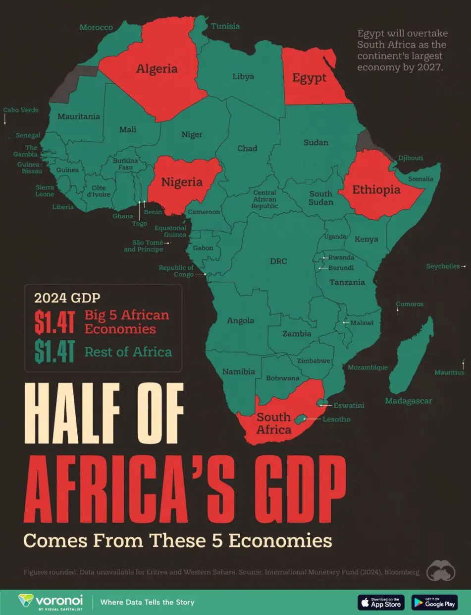 Si l’Algérie est une locomotive, elle ne roule pas seule. Les quatre autres géants du continent affichent également des dynamiques économiques impressionnantes. L’Afrique du Sud, avec son secteur financier développé, le Nigeria, premier producteur de pétrole d’Afrique, ou encore l’Égypte, qui mise sur le tourisme et l’industrie manufacturière, contribuent tous à la croissance économique du continent.