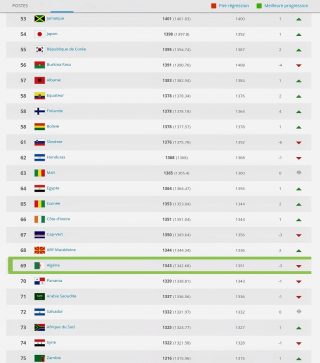 La sélection algérienne de football a perdu trois places au classement mensuel de la Fédération internationale (FIFA) publié jeudi, passant de la 66è à la 69è position, alors qu’au niveau africain, elle occupe le 14è rang. Sur la scène continentale, les »Verts » demeurent en dehors du Top 10 dominé par le trio : Tunisie (23e mondial), Sénégal (25e) et RD Congo (40e). La sélection du Bénin, prochain adversaire des hommes de Djamel Belmadi, en octobre prochain dans le cadre des éliminatoires de la Coupe d’Afrique des nations 2019, occupe la 88è place mondiale. Les deux autres équipes figurant dans le groupe de l’Algérie lors de ces éliminatoires, le Togo et la Gambie, occupent respectivement la 123è et la 171è places. Pour la première fois depuis sa création il y a 25 ans, deux équipes trônent ensemble en tête du classement mondial, puisque la Belgique a rejoint la France championne du monde sur la plus haute marche du podium grâce à ses deux dernières victoires, notamment face à l’Islande (3-0) en Ligue des Nations. Le prochain classement mondial de la FIFA sera publié le 25 octobre.