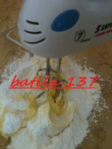 - dans un large bol, mélangez le beurre, le sucre glacé , loeuf , la vanille