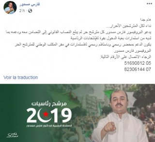 « Le professeur Fares Mesdour appelle tout candidat libre (à la présidentielle) n’ayant pas recueilli suffisamment de parrainage à se solidariser avec lui et le soutenir avec ses formulaires de souscription pour être en force lors des élections », lit-on sur sa page Facebook.