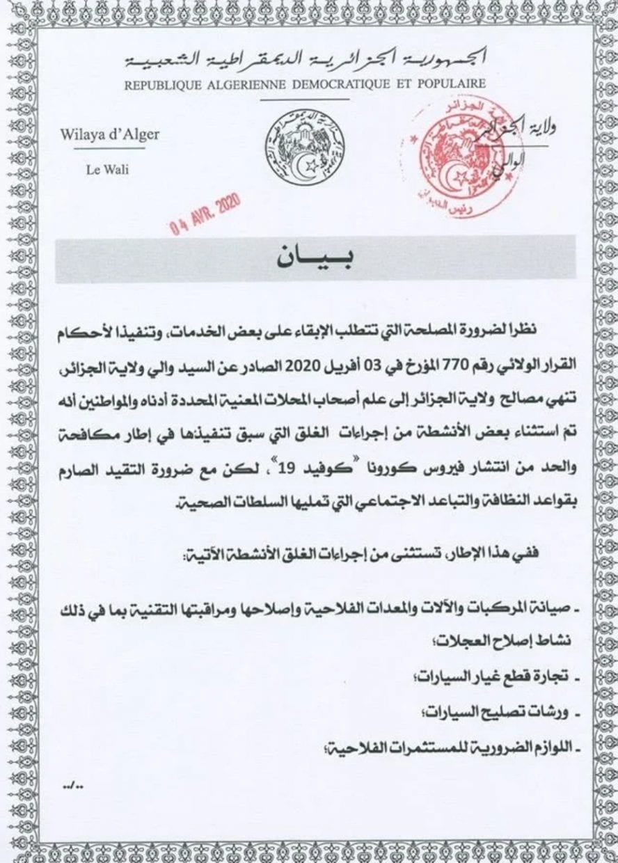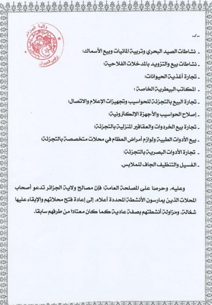 La wilaya d’Alger a publié, ce samedi, dans un communiqué, une liste de commerces qui sont autorisés à reprendre leurs activités en cette période de confinement.