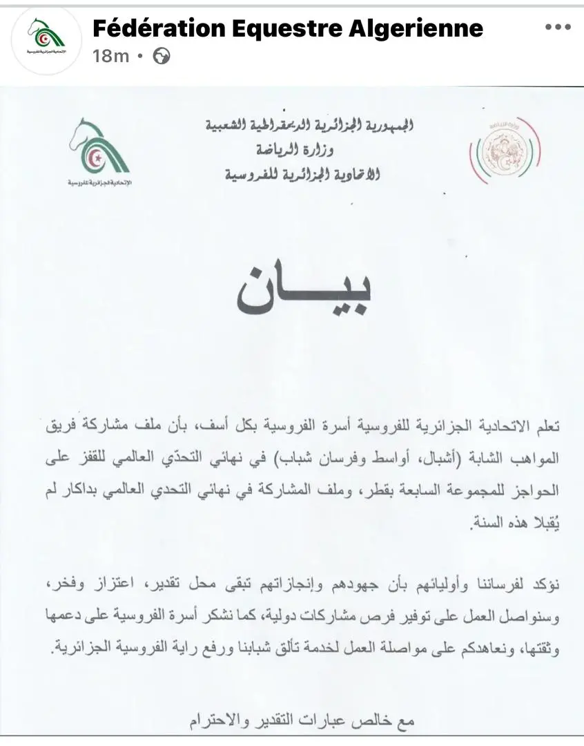 La tension est montée d’un cran ces derniers jours. Une délégation algérienne devait se rendre à Doha, au Qatar, pour prendre part à la finale du championnat mondial d’équitation, l’un des rendez-vous les plus prestigieux du calendrier. Mais, comme ce fut déjà le cas à trois reprises auparavant, le ministère a refusé de délivrer les autorisations de déplacement. Du coup, toute la délégation a été contrainte de rester à Alger, laissant passer une opportunité rare d’exposer le savoir-faire algérien à l’échelle mondiale.