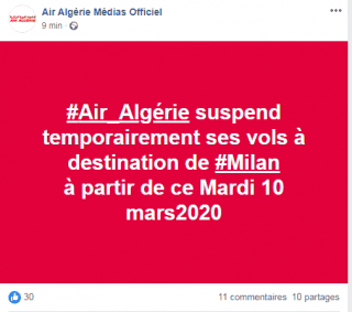 La compagnie aérienne algérienne, Air Algérie a annoncé, via un communiqué, la suspension temporaire de ses vols vers la ville italienne, Milan , à partir de ce mardi 10 mars 2020.