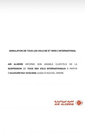 Air Algérie informe son aimable clientèle de la suspension de tous les vols, de et vers l’international à partir d’aujourd’hui et jusqu’à nouvel ordre.