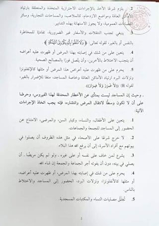 Le communiqué ayant sanctionné la réunion indique qu’il est considéré Haram (péché) de se rendre dans les lieux publics et les mosquées pour les personnes atteintes du coronavirus, ou qui présentent des symptômes grippaux.