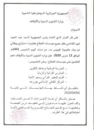 Les nouvelles décisions entrent dans le cadre de la lutte contre la propagation du coronavirus, rappelons que l’Algérie a enregistré ce jeudi son premier décès, un homme de 67 ans qui était hospitalisé au CHU de Blida. Elle a également enregistré cinq nouveaux cas, portant à 24 le total cas confirmés.