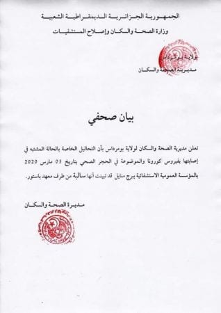 La Direction de la santé et de la population, de la wilaya de Boumerdes , a annoncé aujourd’hui, jeudi que les analyses du cas suspecté du nouveau coronavirus, qui étaient en quarantaine, se sont révélées négatives, selon les résultats d’analyse de l’Institut Pasteur à Alger.