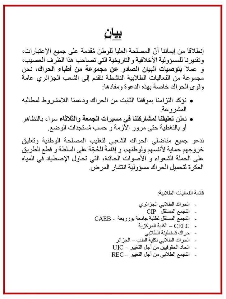 « Nous appelons tous les militants du mouvement populaire à prévaloir dans l’intérêt national et à suspendre leur sortie afin de se protéger, par ailleurs nous affirmons notre attachement à notre position ferme sur le Hirak et notre soutien inconditionnel à ses exigences légitimes ».