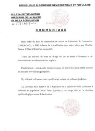 La Direction de la Santé, de la Population et de la Réforme Hospitalière de la Wilaya de Tizi-Ouzou a publié, aujourd’hui, jeudi un communiqué confirmant que les tests de l’Institut Pasteur ont confirmé l’existence d’un cas de Coronavirus dans la wilaya .