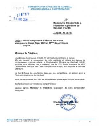 La Confédération Africaine de Handball (CAHB) a décidé de reporter le 36 Championnat d’Afrique des Clubs de Handball programmé en Algérie à une date ultérieure en raison de la propagation du Coronavirus.