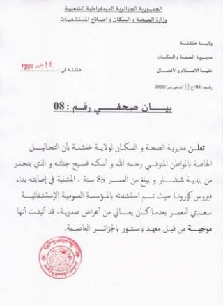 Selon la déclaration de la Direction de la santé, Il s’agit d’un homme de 85 ans hospitalisé au niveau de l’hôpital , Saadi Maammar, et qui vit dans la commune de Chechar dans la wilaya de Khenchela, ce nouveau cas porte le nombre de décès l’épidémie mondiale en Algérie à 12 .