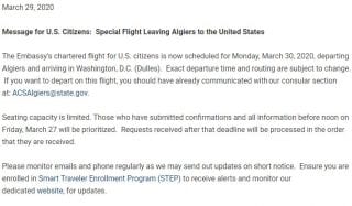 L’ambassade des Etats-Unis en Algérie a annoncé ce dimanche qu’un vol à destination Dallas est programmé pour demain, pour les ressortissants américains voulant rejoindre leur pays.