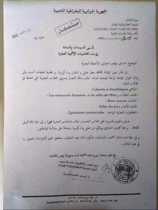 La direction du commerce de la wilaya d’Alger a émis une note, ce dimanche dans laquelle elle appelle à la fermeture de plusieurs types de commerce, dans le cadre des mesures préventives contre la propagation du coronavirus.