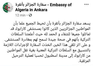 L’ambassade d’Algérie à Ankara la capitale de la Turquie a annoncé vendredi que les algériens atteints du coronavirus covid-19 hospitalisés dans les hôpitaux turques sont complètement guéris.