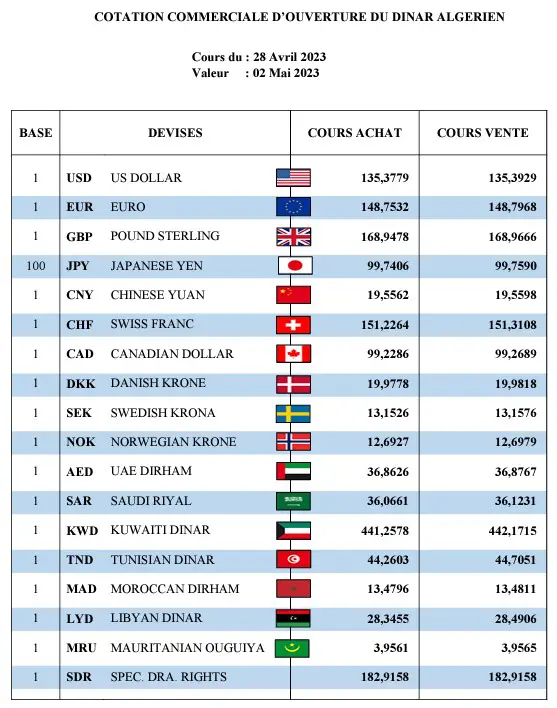 Les cotations commerciales d’ouverture du dinar algérien à la Banque d’Algérie du 28 avril au 2 mai 2023 indiquent que la monnaie européenne unique s’achète à 148.75 dinars algériens et se vend à 148.79 dinars algériens. D’après la même source, le dollar américain s’échange contre 135.37 dinars algériens à l’achat et contre 135.39 dinars algériens à la vente.