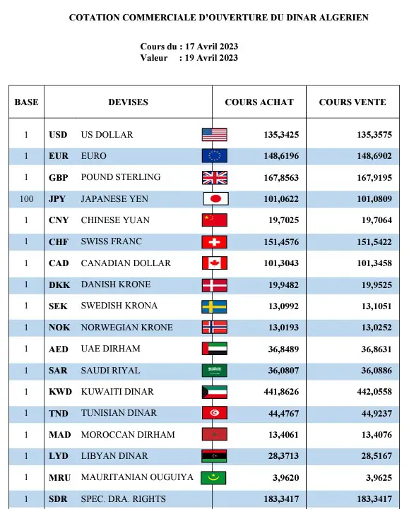 En outre, les cotations commerciales d’ouverture du dinar algérien à la Banque d’Algérie du 17 au 19 avril 2023 indiquent que le dollar américain unique s’échange contre 135.34 dinars algériens à l’achat et contre 135.35 dinars algériens à la vente. Cependant, au marché informel du Square d’Alger, le taux d’achat du billet vert unique se maintient à 204.00 dinars algériens et son taux de vente à 206.00 dinars algériens.