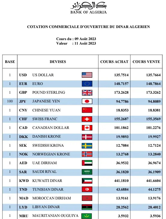 Enfin, le tableau ci-dessous vous récapitule les cours de change du dinar algérien face aux principales devises étrangères en Banque et au marché noir pour ce jeudi 10 août 2023 :