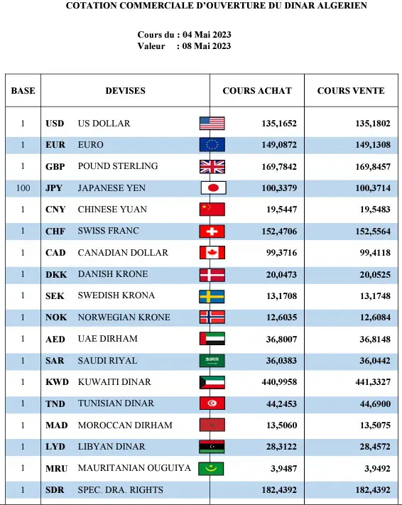 En outre, les cours de change du marché officiel de la Banque d’Algérie indiquent que le taux d’achat de l’unité de l’euro est de 149.08 dinars algériens et son taux de vente de 149.13 dinars algériens. De plus, les cotations commerciales d’ouverture du dinar algérien, du 4 au 8 mai 2023, affichent le billet vert unique à 135.16 dinars algériens à l’achat et à 135.18 dinars algériens à la vente.