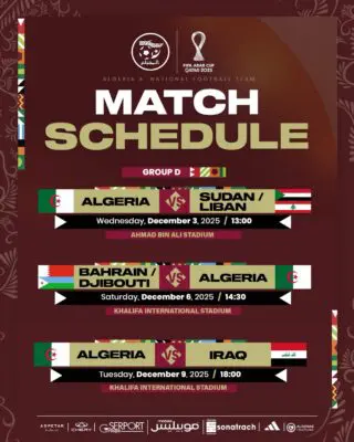 La Fédération algérienne de football a dévoilé le programme de la sélection nationale A’ lors de la Coupe Arabe FIFA-2025. Un tournoi qui se tiendra du 1er au 18 décembre 2025.