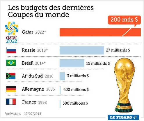 Un chiffre qui dépasse de loin les sommes consacrées aux précédentes éditions du mondial. À titre le comparaison, les enveloppes des 5 derrières éditions de la coupe du monde, celle organisée en France en 1998, au Japon et en Corée du Sud en 2002, l’Allemagne en 2006, l’Afrique du Sud en 2010, le Brésil en 2014 et la Russie en 2018 ; n’atteignent pas, toutes réunies, les 25% du budget consacré à l’édition de 2022.