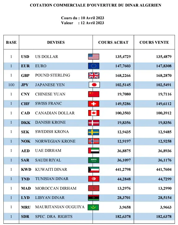 Le tableau ci-dessous résume les taux de change de la monnaie nationale face aux principales devises étrangères pour ce mardi 11 avril 2023 :