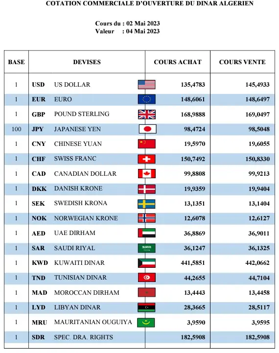 Dans le tableau ci-dessous, nous vous résumons les taux de change du dinar algérien face aux principales devises étrangères ce mercredi 3 mai 2023 :
