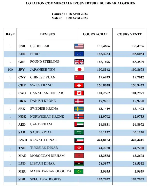 Selon les cotations commerciales d’ouverture du dinar algérien à la Banque d’Algérie du 18 au 20 avril 2023, la monnaie européenne unique s’échange contre 148.47 dinars algériens à l’achat et contre 148.50 dinars algériens à la vente. De son côté, le dollar américain unique s’est établi à 135.46 dinars algériens à l’achat et à 135.47 dinars algériens à la vente, et ce, sur le même marché de change.