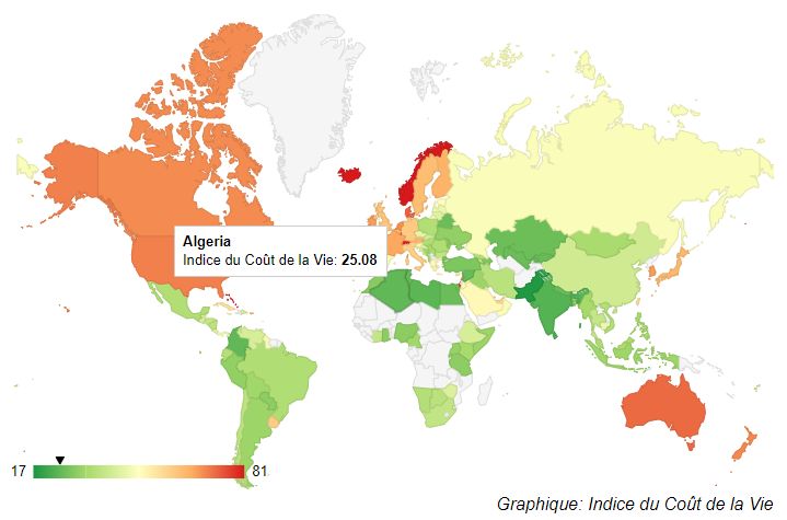 L’indice prend en compte les coûts des produits alimentaires, du transport en commun, du loyer et des charges fixes, des services de restaurations, des dépenses vestimentaires, de la garde des enfants, des sports et loisirs. Pour l’Algérie, il se base sur un salaire net mensuel moyen de 35 963,38 DZD.