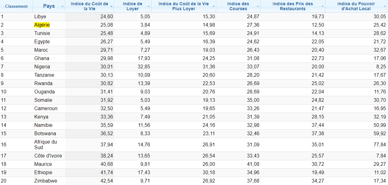 Afin de donner aux chiffres mentionnés en haut un aspect plus explicite et savoir où se situe l’Algérie en matière de « coût de la vie » par rapport aux autres pays du monde et du continent africain, — nous nous sommes penchés sur l’indicateur appelé « pouvoir d’achat relatif ». Celui-ci compare les prix différents des biens et services au salaire mensuel moyen du pays. Pour l’Algérie, il a été estimé à presque 36 000 DZD.