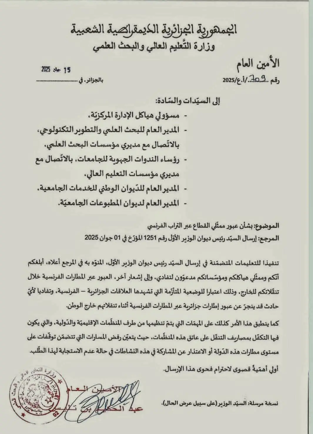 Dans une note officielle, le ministère explique ainsi : « En application des instructions transmises par le chef de cabinet du Premier ministre, nous demandons à l’ensemble des cadres et des représentants des établissements universitaires de ne pas transiter par les aéroports français pour tout déplacement à l’étranger, jusqu’à nouvel ordre, afin d’éviter d’éventuels incidents liés à la situation actuelle entre l’Algérie et la France. »