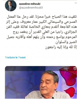 Aujourd’hui le ministre de la culture a annoncé le décès de l’acteur algérien Amar Maarouf, en présentant ces condoléances à la famille du défunt, via son compte Twitter.